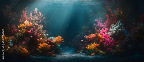 © khunnapat, Obraz premium Underwater Coral Reef Scene with Sunlight and Fish