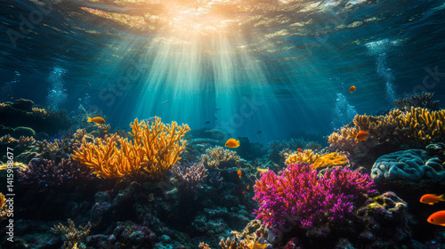 Fototapeta premium Underwater Coral Reef Scene with Sunlight Rays and Colorful Marine Life