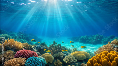 Naklejka premium Underwater Coral Reef Scene with Sunlight Rays and Tropical Fish ocean marine...