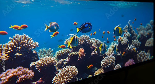 Naklejka premium Underwater Coral Reef Scene with Tropical Fish Swimming