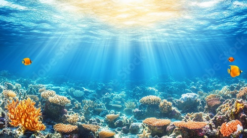 Fototapeta premium Underwater coral reef, sun rays, fish, ocean, vibrant scene, marine life, tropical, background, screen