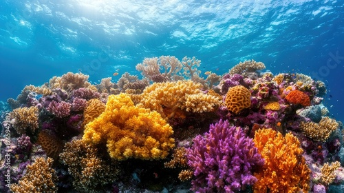 Fototapeta premium Underwater coral reef vibrant colors. Sunlight. Possible use Stock photo
