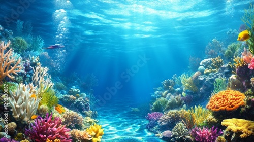 Naklejka premium Underwater coral reef vibrant marine life, sun rays, peaceful scene....