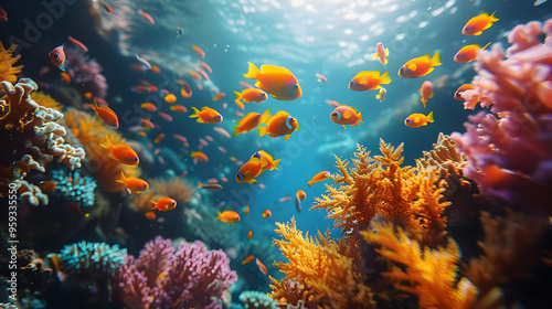 Naklejka premium Underwater Coral Reef With Orange Fish - Realistic Image