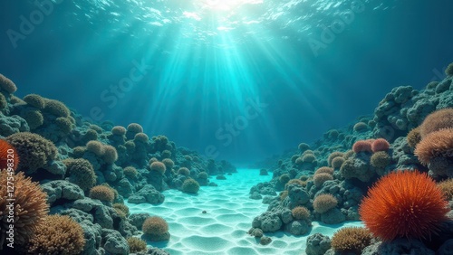 Fototapeta premium Underwater coral reef with sunlight rays illuminating sandy seabed and corals