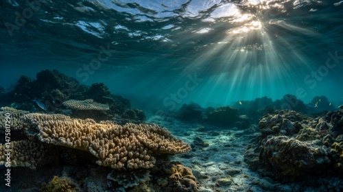 © Pornfa, Fototapeta premium Underwater Coral Reef with Sunlight Streaming Through Waves in a Vibrant Marine Environment
