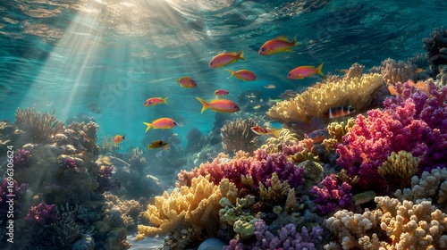 © Huzaifa, Naklejka premium Underwater coral reef with tropical fish swimming in the ocean marine life aquatic ecosystem scene view