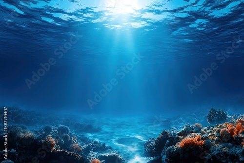 Fototapeta premium Underwater corals on the ocean bottom. Blue background with clear water and sunlight underwater in sea