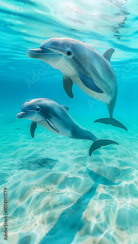 Obraz premium Underwater Dolphins Swimming Gracefully in Ocean