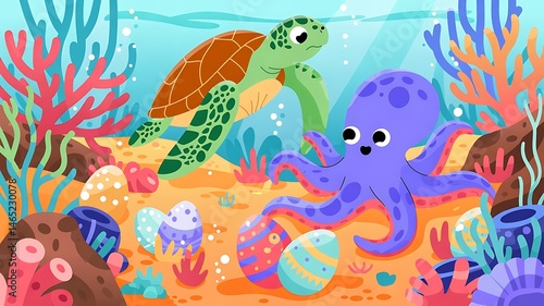 Fototapeta premium Underwater Easter Hunt – sea creatures like turtles and octopuses discovering...