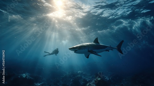 Fototapeta premium Underwater Encounter Diver and Great White Shark in Sunlit Ocean Depths