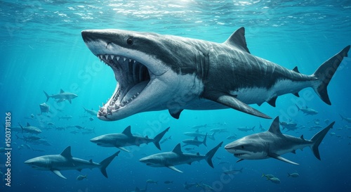Naklejka premium Underwater encounter with a colossal megalodon surrounded by smaller sharks