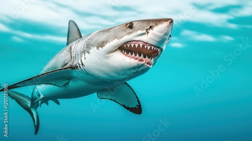 Naklejka premium Underwater encounter with a shark ocean depths marine wildlife vibrant...