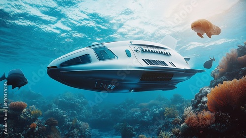 Fototapeta premium Underwater Exploration: A Submersible Vehicle Navigating a Vibrant Coral Reef