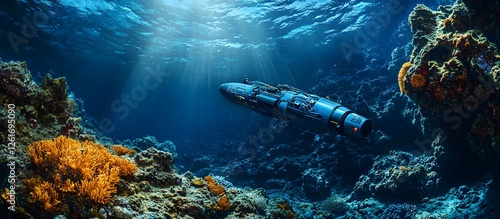 Fototapeta premium Underwater exploration vehicle near coral reef