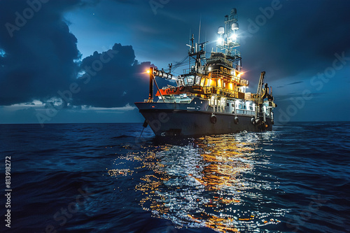 © Degimages, Fototapeta premium Underwater exploration vessel surveys ocean floor for rare minerals amidst deep-sea.
