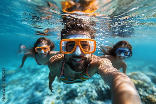 Naklejka premium Underwater Family Fun: Snorkeling Adventure in Crystal Clear Waters