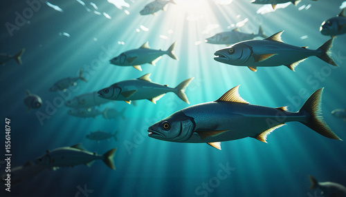 Obraz premium Underwater fish swimming in beams of sunlight
