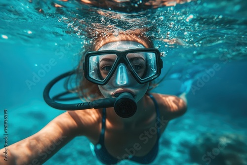 © LimeSky, Naklejka premium Underwater girl in mask scuba dives