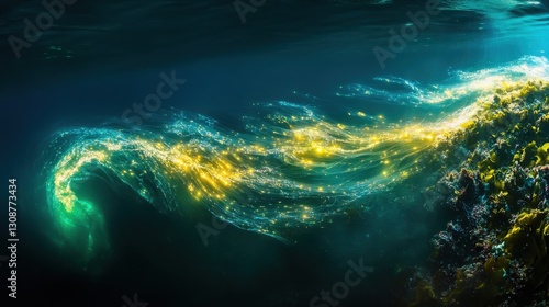 © Ariestia, Fototapeta premium Underwater Glowing Light Stream Flows Near Coral Formation