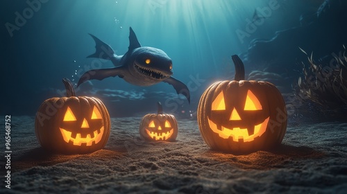 Fototapeta premium Underwater Halloween party, eerie sea creatures, glowing jack-o'-lanterns, 3D illustration