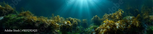 © HDR Image Creator, Naklejka premium Underwater hdr panorama of lush kelp forests ocean depths serene environment