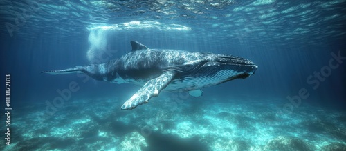 Naklejka premium Underwater humpback whale gracefully swimming in the ocean.