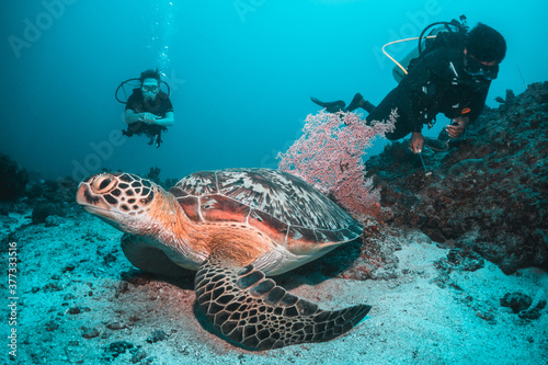 © Aaron, Naklejka premium Underwater image of a green sea turtle, with scuba divers swimming and observing among colorful coral reef in clear blue water