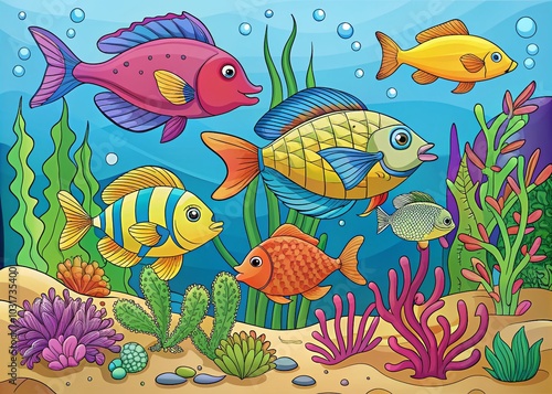 © Four888, Naklejka premium Underwater Life Coloring Book Illustration Featuring Angler Fish and Marine Animals