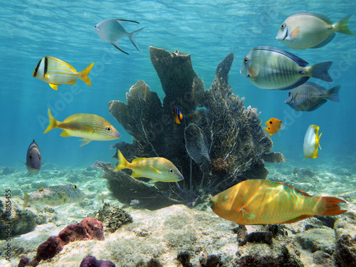 Fototapeta premium Underwater life with sea fan soft coral and colorful tropical fish in the Caribbean sea