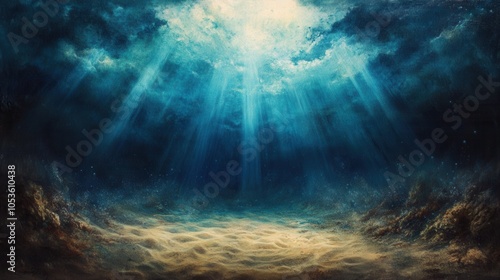© Roman, Fototapeta premium Underwater light rays sandy floor. Generative AI