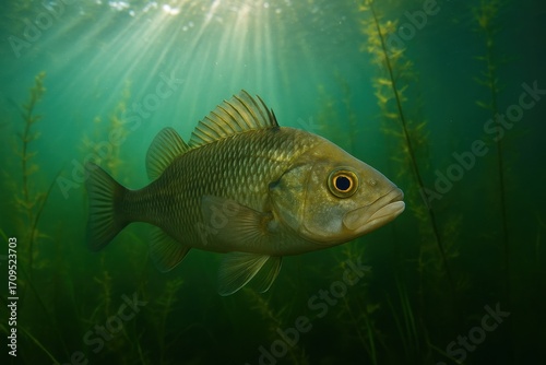 © CrazyJuke, Fototapeta premium Underwater Luminescence: A solitary fish gracefully navigates the depths, its scales shimmering under a radiant beam of light, revealing the serene beauty of an aquatic realm.