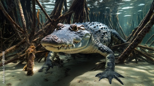 Obraz premium Underwater mangrove crocodile, snorkel, hidden in roots, sunlit shallows