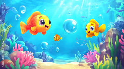 © Sahraya, Naklejka premium Underwater marine illustration with fish in aquarium cartoon game background. Deep under sea scene landscape of nautical fauna with bubbles. Cute fish life adventure on seafloor sand.