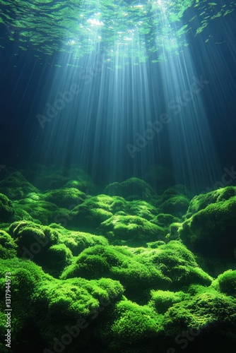 Fototapeta premium Underwater mossy landscape illuminated by sunlight
