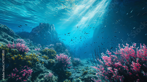 Fototapeta premium Underwater mountains covered with marine plants, creating fantastic contours,...