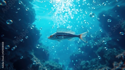 Fototapeta premium Underwater Needlefish Seascape, Blue Fish, Bubbles, Bright Colors, Sharp Focus, Stunning Ocean Scene