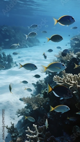 © Chiving, Fototapeta premium Underwater Ocean Scene with Marine Life and Seascape Elements