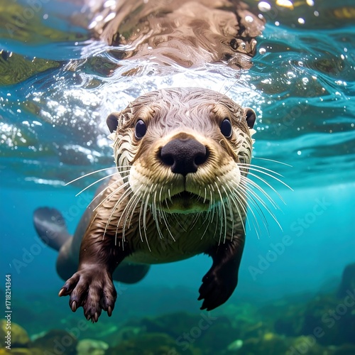 © Pandi, Fototapeta premium Underwater otter close-up in clear water