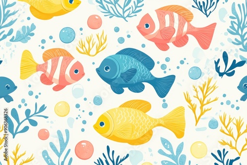 © Phraewa_Aumnartsak, Naklejka premium Underwater Paradise - Seamless Pastel Cartoon Pattern with Tropical Fish, Sea Plants, and Bubbles on Light Background