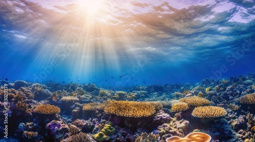 Naklejka premium Underwater Paradise: Sunbeams Illuminate Vibrant Coral Reef