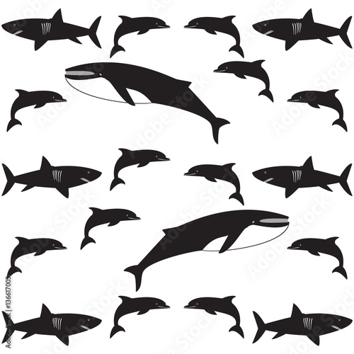 © miaynata, Fototapeta premium underwater pattern dolphin shark whale black