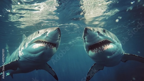 © Yevhen, Obraz premium Underwater perspective stunning view of great white sharks swimming near the water s surface