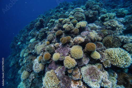 © Siyuan Huang, Naklejka premium Underwater photo of a coral reef with various round, spiky corals in shades of beige, brown, and green, set against a dark blue ocean background.