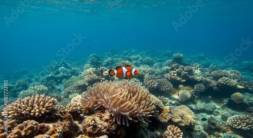© Muneeb, Fototapeta premium Underwater photo shows a clownfish swimming among coral and anemones in a tropical reef. Ocean life backdrop for nature and science presentations.