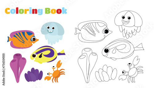 Naklejka premium Underwater plants, tropical fish and crab. Cartoon style illustration of...