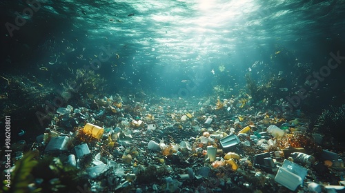 Fototapeta premium Underwater Plastic Pollution Crisis:Haunting Underwater Scene of Plastic Waste and Marine Life
