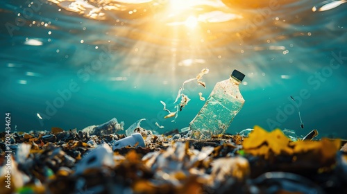 Fototapeta premium Underwater Pollution with Plastic Bottle and Colorful Debris in Clear Water