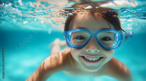 Naklejka premium Underwater portrait of happy child in swimming pool.