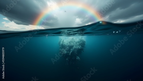 Fototapeta premium Underwater Reef and Rainbow Sky Split View